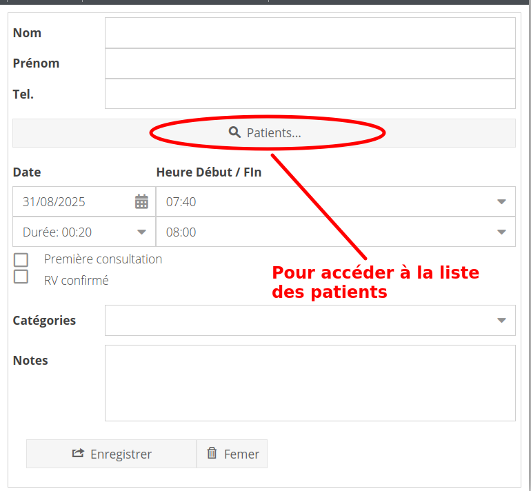 - (4) Cliquez sur “Sélection du patient” afin de compléter automatiquement la fenêtre de prise de rendez-vous.