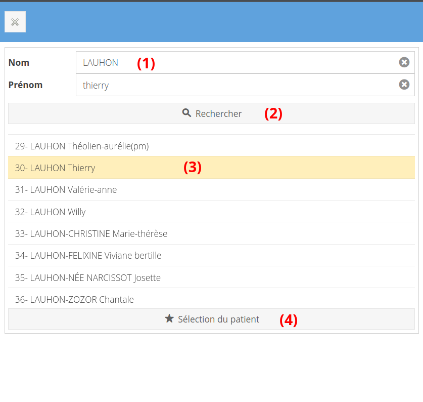 - (1) Saisissez le nom du patient à rechercher. Pour plus de précision, vous pouvez indiquer le prénom.